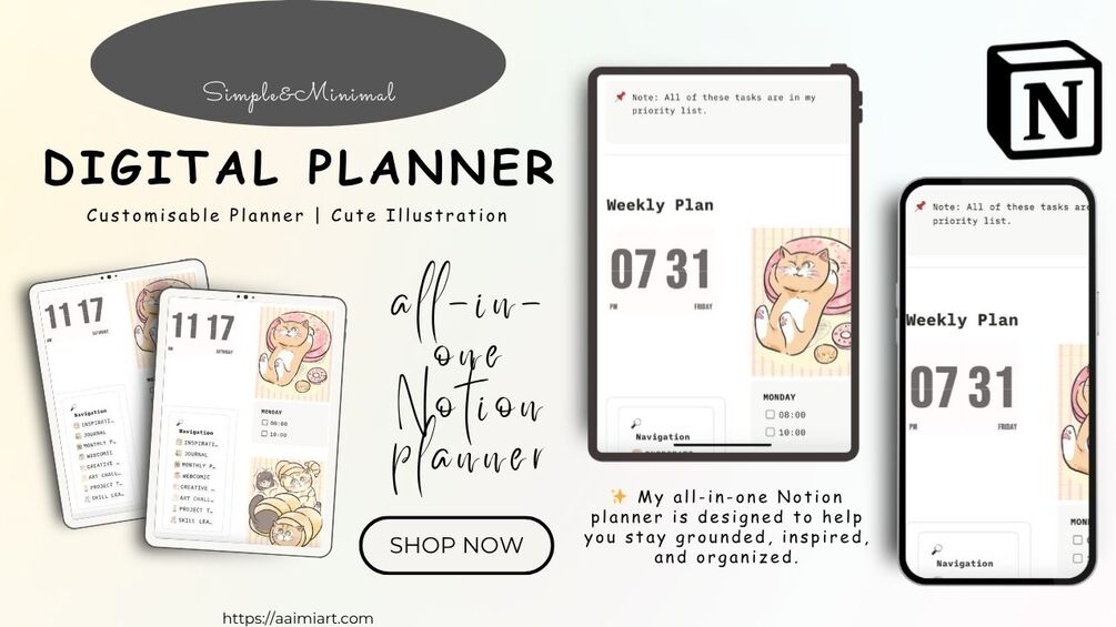 Notion Monthly Planner | Aesthetic Digital Planner with Original Illustrations | Creative All-in-One Template | Aaimi Art Studio